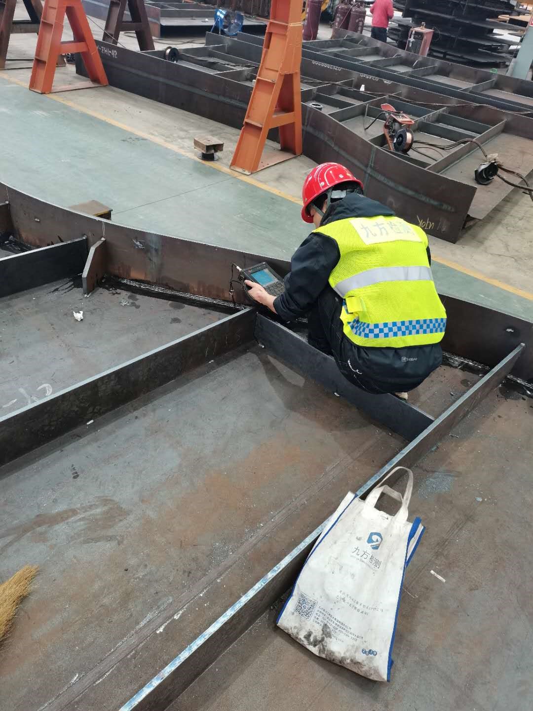 2020年6月29日,九方檢測(cè)工程師對(duì)廠內(nèi)制作焊縫開始檢測(cè)。檢測(cè)內(nèi)容包括鋼結(jié)構(gòu)制作廠內(nèi)及現(xiàn)場(chǎng)安裝焊縫無損檢測(cè)、鋼板無損檢測(cè)、鋼材理化性能檢測(cè)、焊材理化性能檢測(cè)、涂裝質(zhì)量及其原材料檢測(cè)、緊固件檢測(cè)、焊接工藝評(píng)定。為了能更好地完成檢測(cè)任務(wù),九方檢測(cè)專門成立了創(chuàng)業(yè)大橋檢測(cè)項(xiàng)目部,人員及設(shè)備均優(yōu)先配備。