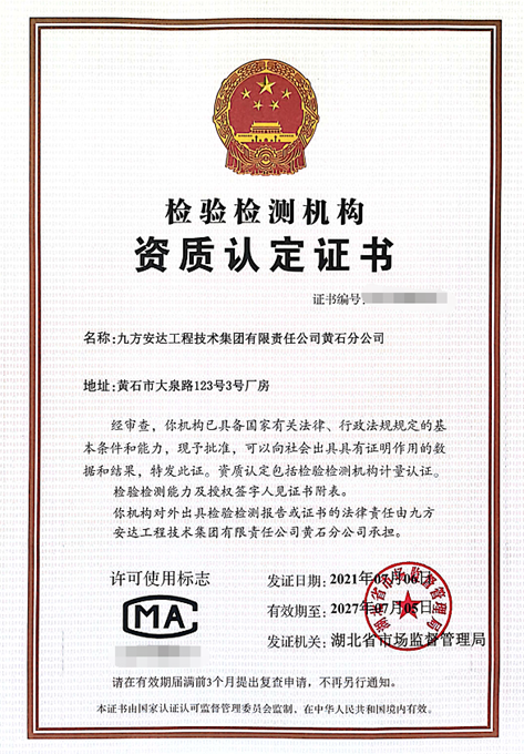 2021年7月6日,九方安達(dá)工程技術(shù)集團(tuán)有限責(zé)任公司黃石分公司(下稱黃石分公司)獲得湖北省市場監(jiān)督管理局頒發(fā)的檢驗檢測機構(gòu)資質(zhì)認(rèn)定證書。
