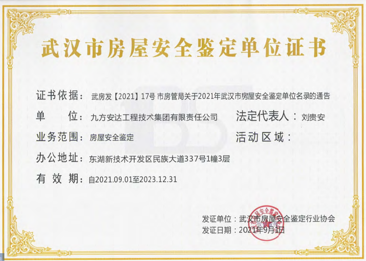 2021年9月1日。根據(jù)市住房保障房管局關(guān)于2021年武漢市房屋安全鑒定單位名錄的通告,九方安達(dá)工程技術(shù)集團(tuán)有限責(zé)任公司(簡(jiǎn)稱(chēng)九方檢測(cè))順利取得由武漢市房屋安全鑒定協(xié)會(huì)頒發(fā)的武漢市房屋安全鑒定單位證書(shū),至此九方檢測(cè)房屋安全鑒定單位證書(shū)已延續(xù)至2023年12月31日。