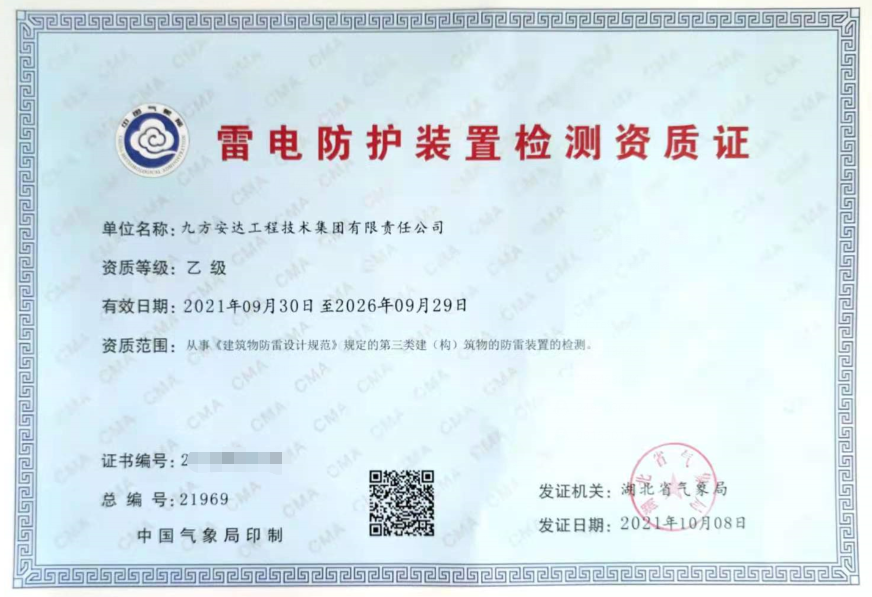 2021年10月8日,九方安達(dá)工程技術(shù)集團(tuán)有限責(zé)任公司(下稱(chēng):九方檢測(cè))取得了由湖北省氣象局頒發(fā)的雷電防護(hù)裝置檢測(cè)資質(zhì)證書(shū)。