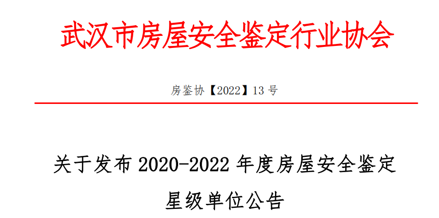 2022年12月12日,武漢市房屋安全鑒定行業(yè)協(xié)會公布2020至2022年度房屋安全鑒定星級單位名單。經(jīng)過各單位自主申報、主管部門審查、專家評審、會長辦公會審議通過和網(wǎng)上公示等流程,九方安達(dá)工程技術(shù)集團(tuán)有限責(zé)任公司(下稱九方檢測)最終被評為2020至2022年度武漢市房屋安全鑒定五星級單位。