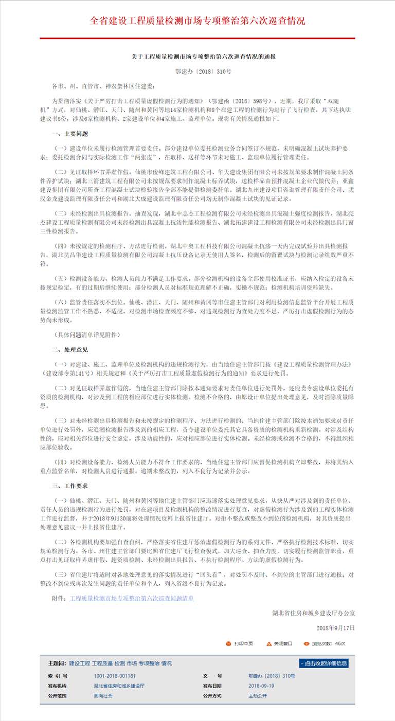 湖北省建設(shè)工程質(zhì)量檢測市場專項整治第六次巡查情況通報