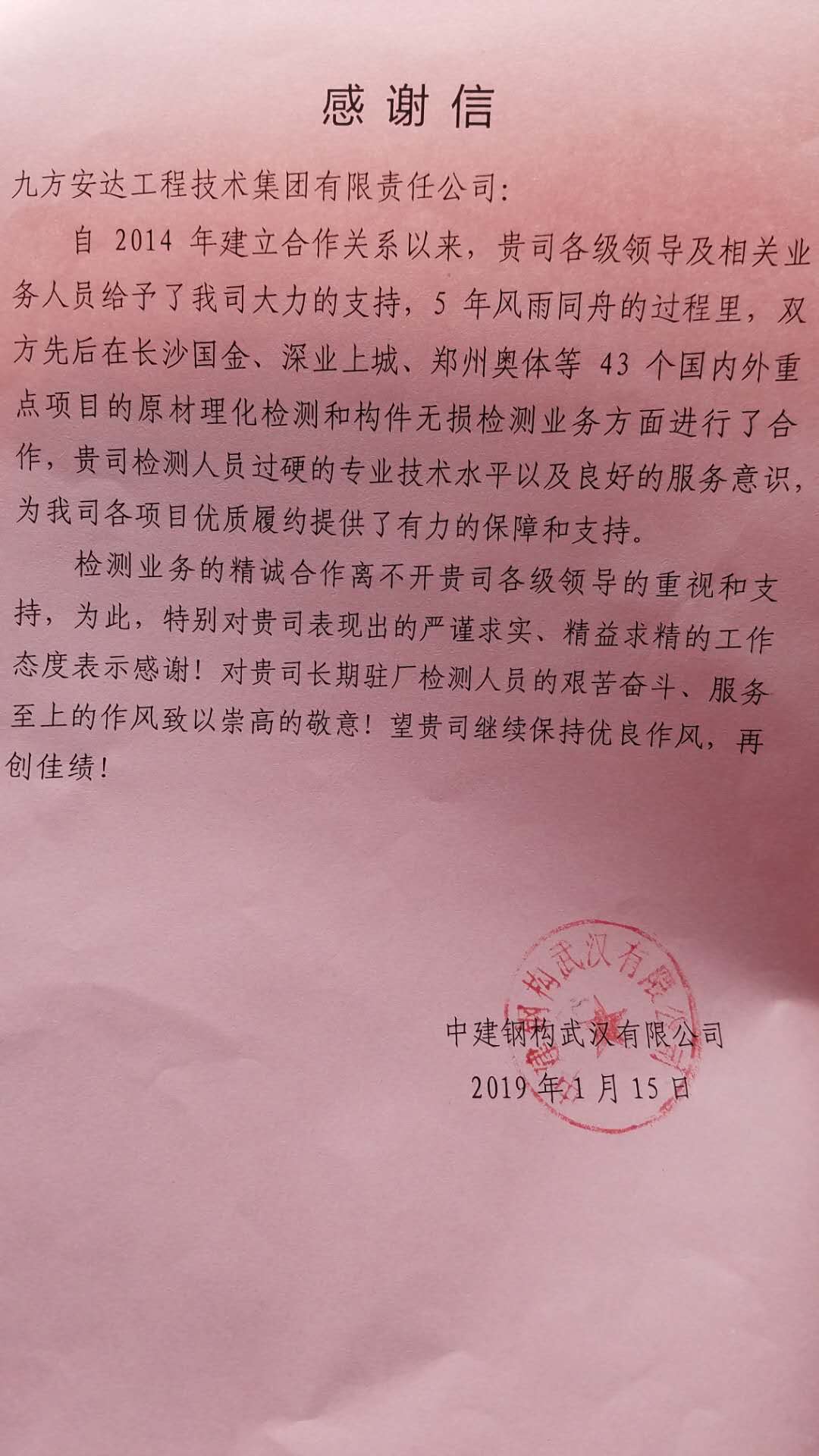 中建鋼構(gòu)發(fā)送九方檢測(cè)的感謝信