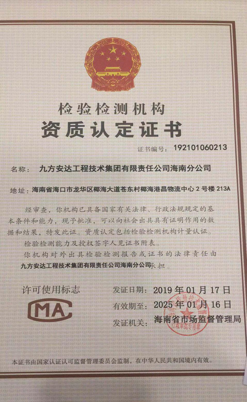 2019年1月17日,在九方安達(dá)集團公司大力下,經(jīng)過海南和湖北分公司同事長期共同努力,九方安達(dá)工程技術(shù)集團有限責(zé)任公司海南分公司取得《檢驗檢測機構(gòu)資質(zhì)認(rèn)定證書》。