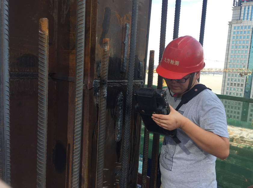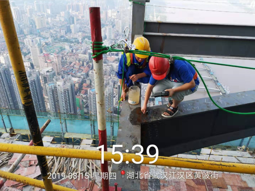 與此同時,在長江對岸遙相呼應的華中第一高樓綠地中心,咱們九方的工程師們也正在進行該項目最后階段的無損檢測工作。