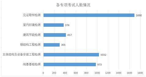各專項(xiàng)考試人次分別為:地基基礎(chǔ)工程檢測(cè)專項(xiàng)973人,主體結(jié)構(gòu)及設(shè)備安裝工程檢測(cè)專項(xiàng)1032人,鋼結(jié)構(gòu)工程檢測(cè)專項(xiàng)301人,建筑節(jié)能檢測(cè)專項(xiàng)417人,室內(nèi)環(huán)境檢測(cè)專項(xiàng)374人,見(jiàn)證取樣檢測(cè)專項(xiàng)1690人,累計(jì)考試人次為:4787人次。詳見(jiàn)圖2。
